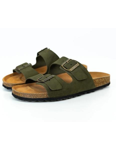 Sandalias de doble hebilla tejido de ante y fabricadas en España . comodidad gracias a su planta en corcho 100 % natural , para esos días casuales .